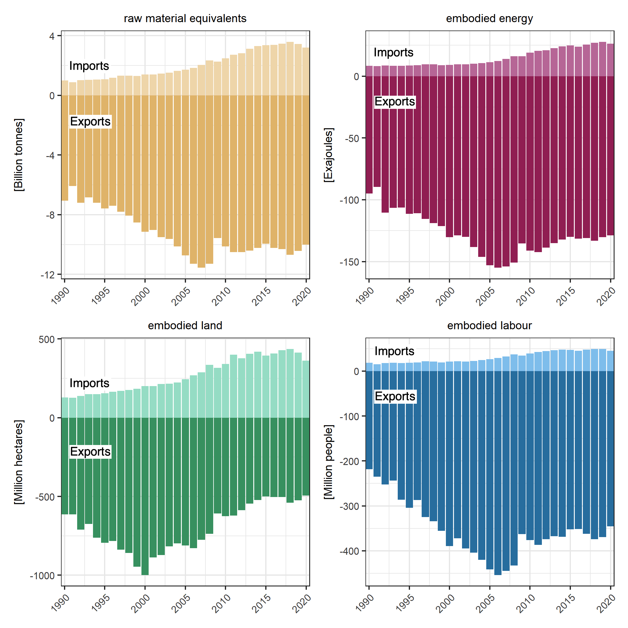 Source: materials, energy and land are based on Hickel, Dorninger, Wieland & Suwandi, Global Environmental Change (2022), updated with GLORIA to 2020; labour is from Hickel, Hanbury Lemos & Barbour, Nature Communications (2024).